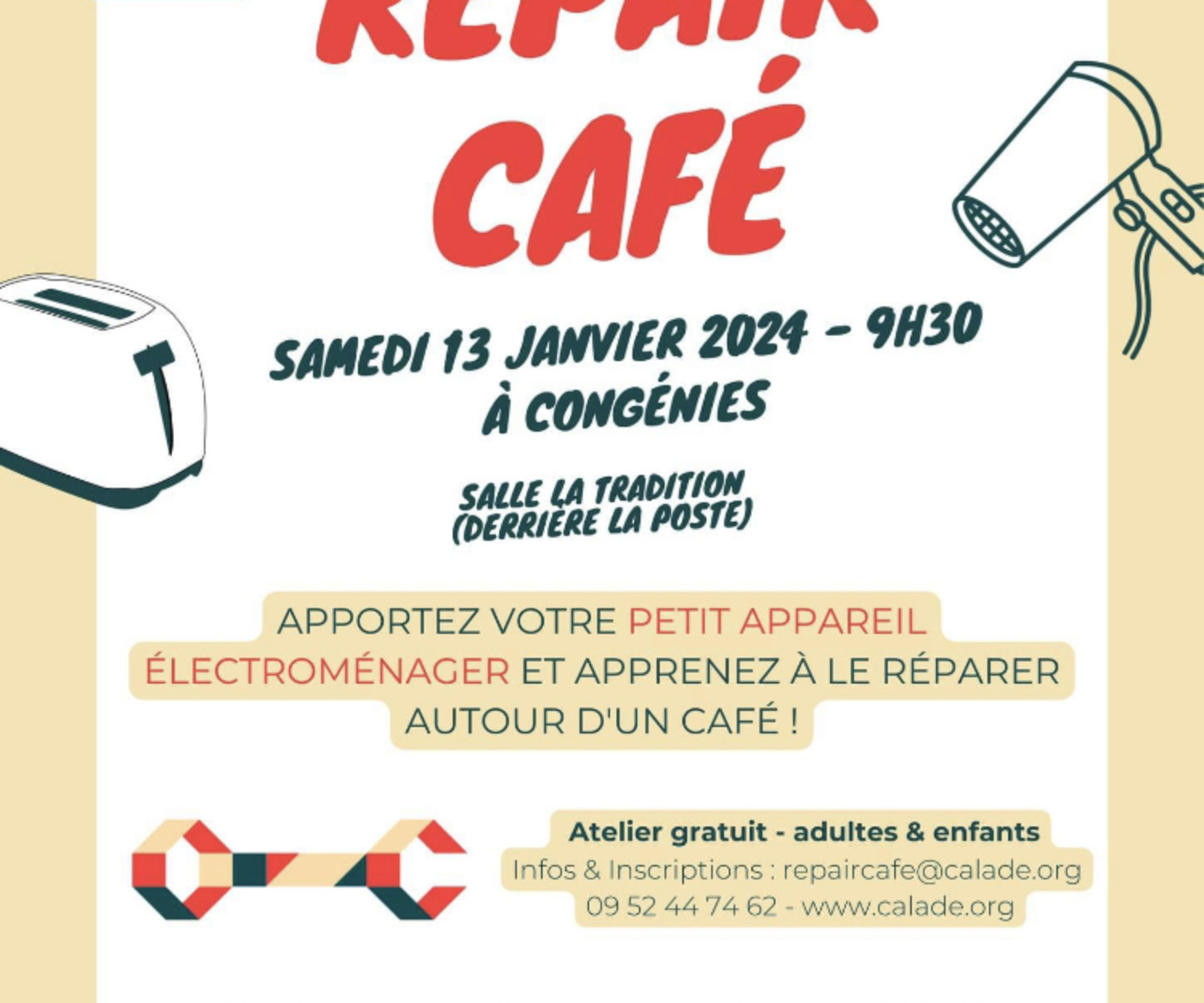 AGENDA 09 Jan 2024 Repair CaféUn nouvel atelier de Repair Café aura lieu samedi 13 janvier ! M’hésitez pas à venir tenter de (faire) réparer…