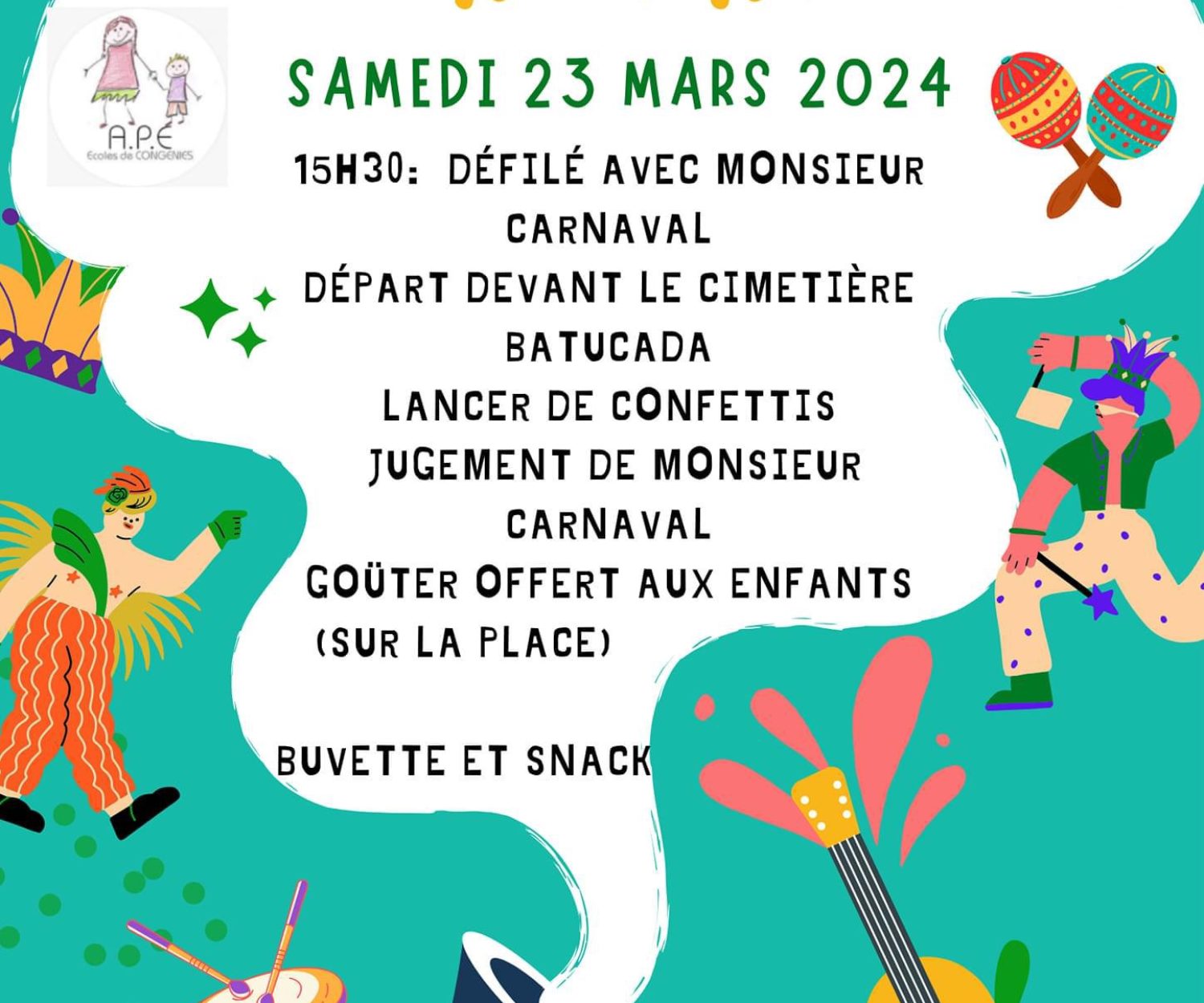 AGENDA 05 Mar 2024 CarnavalQui dit Mars dit Carnaval!! Le 23 Mars, l’APE attend le plus grand nombre d’entre nous pour défiler au son…