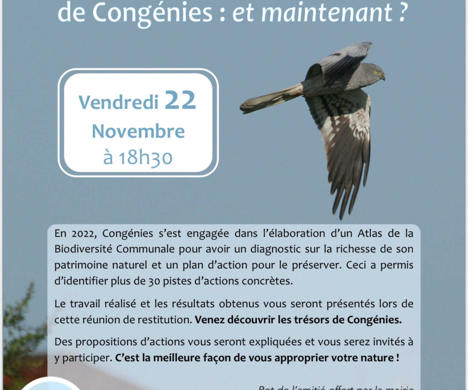 AGENDA 20 Nov 2024 Réunion publique – ABC – Atlas de la Biodiversité de Congenies𝗩𝗼𝘂𝘀 𝗽𝗼𝘂𝘃𝗲𝘇 𝗽𝗮𝗿𝘁𝗶𝗰𝗶𝗽𝗲𝗿 𝗮̀ 𝗹𝗮 𝗿𝗲́𝘂𝗻𝗶𝗼𝗻 𝗱𝗲 𝗰𝗹𝗼̂𝘁𝘂𝗿𝗲 𝗱𝗲 𝗹’𝗔𝘁𝗹𝗮𝘀 𝗱𝗲 𝗹𝗮 𝗕𝗶𝗼𝗱𝗶𝘃𝗲𝗿𝘀𝗶𝘁𝗲́ 𝗱𝗲 𝗖𝗼𝗻𝗴𝗲́𝗻𝗶𝗲𝘀 ! Ce vendredi 22 novembre,…